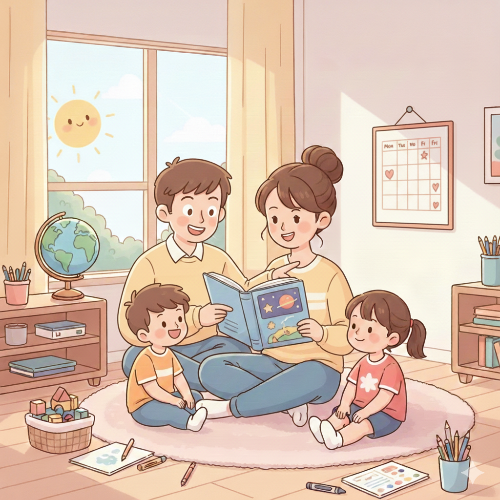 Instead of planning every hour, choose a general time of day for learning activities. This could be after breakfast or before an afternoon break. Keeping the timing consistent helps children know what to expect without making the day feel overly structured. For example, instead of scheduling lessons by the hour, you might read a short story together after breakfast each day and talk about it for a few minutes. Over time, this naturally becomes part of your routine.